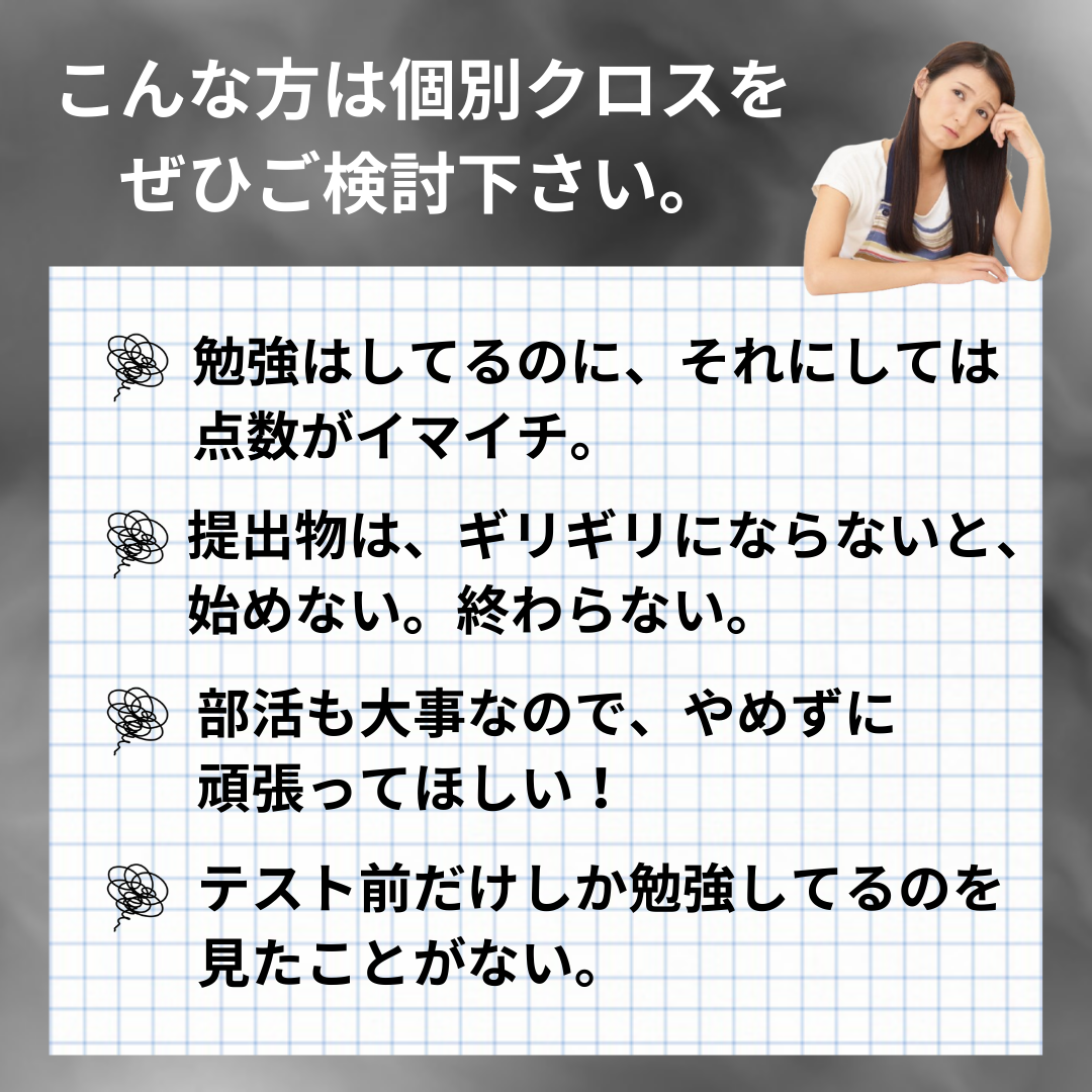 個別クロスの提供する【成績UPする勉強法】についてはコチラをどうぞ(2分6秒)
