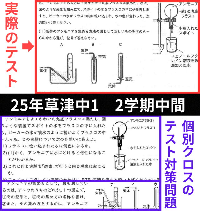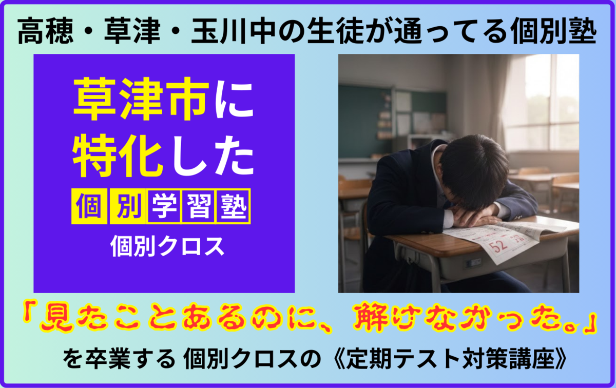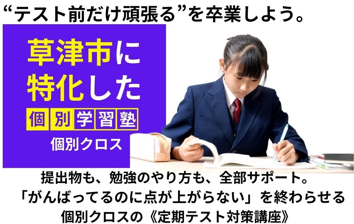 2007年から、高穂中・草津中・玉川中を中心に定期テストを徹底的に研究し、草津市で長年指導してきた実績・経験をもとに、万全の状態でテスト本番を迎えられるよう1人1人に合わせて個別指導します。